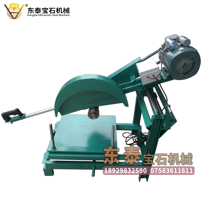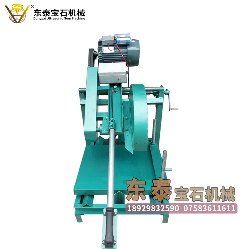 功能:东泰超声波宝石机械设备生产的大型宝石开料机,经过改进,1、增加了行程轨道和右拉杆,使在切割宝石原料时,工作平台前进后退方便简单快捷,既可以定点切割,也可随时在切割过程中前后移动,加快宝石切割速度和切割行程长度,2、选切方便,增加了石料固定卡板,在生产过程中更加安全稳定。3、切割安全高度限定,可以确保将石料切开,也确保刀片不会切割到工作台上。4、右手轮调节移动机器刀片左右移动,进行切割宽度调节方便。5、使用东泰定制宝石机械专用电机,使用力度大,节省电力,使用寿命长,6、使用优质轴承,机器运行平稳,切割精度好,使用寿命长。7、适用于切割50cm以内的宝石原料,石料可在切割台上前后左右移动,最大可以装载24英寸(60cm)的刀片,根据不同需要,可以用不同刀片。8、增加手柄式弱电开关,使用方便,按压开关时机器工作,放松开关时机器断电停止工作,手柄电压采用24V低压电,安全可靠。