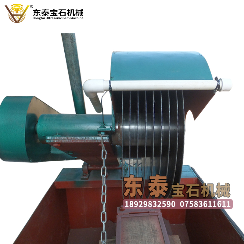功能:东泰超声波宝石机械设备生产的多片自动行程开片机,1、采用双动力配置,优质轴承,经久耐用,稳定性好,2、采取自动行程循环,只需将宝石原料放入行程工作台上稳定即可,一次性开取多片成品片料,无需进行第二次加工,3、开料范围大,精度好,一人可操作4至6台设备,加工速度快,效率高,成本低。4、可以切割出长300mm宽120mm厚6-180mm的成品片料,加工成品高。5、标准配置可安装16英寸刀片,根据客户要求加大型最大可以装载20英寸(50cm)的刀片。6、机器标准使用线切割油,配合有牙刀片,使用效果好,速度快。7、机器在安装刀片时,需要进行校正,将刀片的间隙校正宽度一样大。8、机器在使用过程中,每隔4个小时进行一次刀片开口,这样切割速度更快。9、一次性6mm圆珠用7.5mm夹具可装24片刀片,8mm圆珠用9.5mm夹具可装20片刀片,10mm圆珠用11.5mm夹具可装16片刀片,12mm圆珠用13.5mm夹具可装14片刀片,14mm圆珠用15.5mm夹具可装13片刀片,16mm圆珠用17.5mm夹具可装11片刀片,18mm圆珠用19.5mm夹具可装10片刀片,20mm圆珠用21.5mm夹具可装9片刀片.